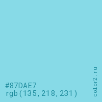 Цвет #87DAE7 в цветовой модели RGB обозначается тремя октетами (135, 218, 231) в десятичном формате и #87DAE7 в шестнадцатиричном (hex) формате, которые являются интенсивностью красного 135 (hex 87), интенсивность зелёного 218 (hex DA) и интенсивность синего 231 (hex E7).
