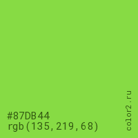 Цвет #87DB44 в цветовой модели RGB обозначается тремя октетами (135, 219, 68) в десятичном формате и #87DB44 в шестнадцатиричном (hex) формате, которые являются интенсивностью красного 135 (hex 87), интенсивность зелёного 219 (hex DB) и интенсивность синего 68 (hex 44).