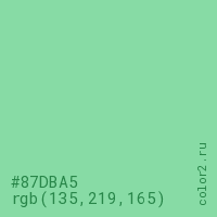 Цвет #87DBA5 в цветовой модели RGB обозначается тремя октетами (135, 219, 165) в десятичном формате и #87DBA5 в шестнадцатиричном (hex) формате, которые являются интенсивностью красного 135 (hex 87), интенсивность зелёного 219 (hex DB) и интенсивность синего 165 (hex A5).