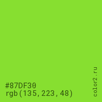 Цвет #87DF30 в цветовой модели RGB обозначается тремя октетами (135, 223, 48) в десятичном формате и #87DF30 в шестнадцатиричном (hex) формате, которые являются интенсивностью красного 135 (hex 87), интенсивность зелёного 223 (hex DF) и интенсивность синего 48 (hex 30).