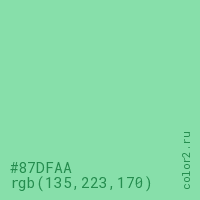 Цвет #87DFAA в цветовой модели RGB обозначается тремя октетами (135, 223, 170) в десятичном формате и #87DFAA в шестнадцатиричном (hex) формате, которые являются интенсивностью красного 135 (hex 87), интенсивность зелёного 223 (hex DF) и интенсивность синего 170 (hex AA).