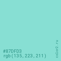 Цвет #87DFD3 в цветовой модели RGB обозначается тремя октетами (135, 223, 211) в десятичном формате и #87DFD3 в шестнадцатиричном (hex) формате, которые являются интенсивностью красного 135 (hex 87), интенсивность зелёного 223 (hex DF) и интенсивность синего 211 (hex D3).