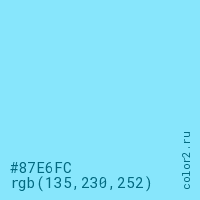 Цвет #87E6FC в цветовой модели RGB обозначается тремя октетами (135, 230, 252) в десятичном формате и #87E6FC в шестнадцатиричном (hex) формате, которые являются интенсивностью красного 135 (hex 87), интенсивность зелёного 230 (hex E6) и интенсивность синего 252 (hex FC).