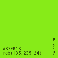 Цвет #87EB18 в цветовой модели RGB обозначается тремя октетами (135, 235, 24) в десятичном формате и #87EB18 в шестнадцатиричном (hex) формате, которые являются интенсивностью красного 135 (hex 87), интенсивность зелёного 235 (hex EB) и интенсивность синего 24 (hex 18).