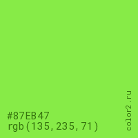 Цвет #87EB47 в цветовой модели RGB обозначается тремя октетами (135, 235, 71) в десятичном формате и #87EB47 в шестнадцатиричном (hex) формате, которые являются интенсивностью красного 135 (hex 87), интенсивность зелёного 235 (hex EB) и интенсивность синего 71 (hex 47).