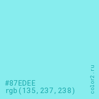 Цвет #87EDEE в цветовой модели RGB обозначается тремя октетами (135, 237, 238) в десятичном формате и #87EDEE в шестнадцатиричном (hex) формате, которые являются интенсивностью красного 135 (hex 87), интенсивность зелёного 237 (hex ED) и интенсивность синего 238 (hex EE).