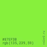Цвет #87EF3B в цветовой модели RGB обозначается тремя октетами (135, 239, 59) в десятичном формате и #87EF3B в шестнадцатиричном (hex) формате, которые являются интенсивностью красного 135 (hex 87), интенсивность зелёного 239 (hex EF) и интенсивность синего 59 (hex 3B).