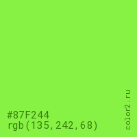 Цвет #87F244 в цветовой модели RGB обозначается тремя октетами (135, 242, 68) в десятичном формате и #87F244 в шестнадцатиричном (hex) формате, которые являются интенсивностью красного 135 (hex 87), интенсивность зелёного 242 (hex F2) и интенсивность синего 68 (hex 44).