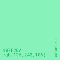 Цвет #87F2BA в цветовой модели RGB обозначается тремя октетами (135, 242, 186) в десятичном формате и #87F2BA в шестнадцатиричном (hex) формате, которые являются интенсивностью красного 135 (hex 87), интенсивность зелёного 242 (hex F2) и интенсивность синего 186 (hex BA).