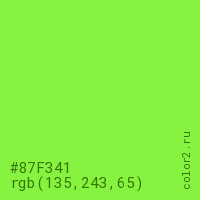 Цвет #87F341 в цветовой модели RGB обозначается тремя октетами (135, 243, 65) в десятичном формате и #87F341 в шестнадцатиричном (hex) формате, которые являются интенсивностью красного 135 (hex 87), интенсивность зелёного 243 (hex F3) и интенсивность синего 65 (hex 41).
