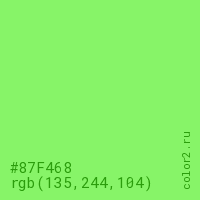 Цвет #87F468 в цветовой модели RGB обозначается тремя октетами (135, 244, 104) в десятичном формате и #87F468 в шестнадцатиричном (hex) формате, которые являются интенсивностью красного 135 (hex 87), интенсивность зелёного 244 (hex F4) и интенсивность синего 104 (hex 68).