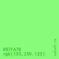 Цвет #87FA7B в цветовой модели RGB обозначается тремя октетами (135, 250, 123) в десятичном формате и #87FA7B в шестнадцатиричном (hex) формате, которые являются интенсивностью красного 135 (hex 87), интенсивность зелёного 250 (hex FA) и интенсивность синего 123 (hex 7B).