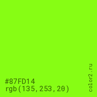 Цвет #87FD14 в цветовой модели RGB обозначается тремя октетами (135, 253, 20) в десятичном формате и #87FD14 в шестнадцатиричном (hex) формате, которые являются интенсивностью красного 135 (hex 87), интенсивность зелёного 253 (hex FD) и интенсивность синего 20 (hex 14).