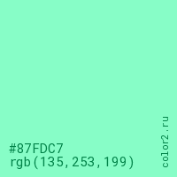Цвет #87FDC7 в цветовой модели RGB обозначается тремя октетами (135, 253, 199) в десятичном формате и #87FDC7 в шестнадцатиричном (hex) формате, которые являются интенсивностью красного 135 (hex 87), интенсивность зелёного 253 (hex FD) и интенсивность синего 199 (hex C7).