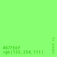 Цвет #87FE6F в цветовой модели RGB обозначается тремя октетами (135, 254, 111) в десятичном формате и #87FE6F в шестнадцатиричном (hex) формате, которые являются интенсивностью красного 135 (hex 87), интенсивность зелёного 254 (hex FE) и интенсивность синего 111 (hex 6F).