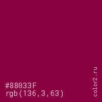 Цвет #88033F в цветовой модели RGB обозначается тремя октетами (136, 3, 63) в десятичном формате и #88033F в шестнадцатиричном (hex) формате, которые являются интенсивностью красного 136 (hex 88), интенсивность зелёного 3 (hex 03) и интенсивность синего 63 (hex 3F).