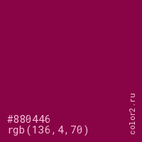 Цвет #880446 в цветовой модели RGB обозначается тремя октетами (136, 4, 70) в десятичном формате и #880446 в шестнадцатиричном (hex) формате, которые являются интенсивностью красного 136 (hex 88), интенсивность зелёного 4 (hex 04) и интенсивность синего 70 (hex 46).