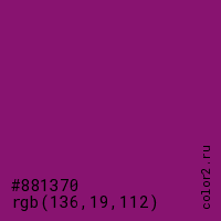 Цвет #881370 в цветовой модели RGB обозначается тремя октетами (136, 19, 112) в десятичном формате и #881370 в шестнадцатиричном (hex) формате, которые являются интенсивностью красного 136 (hex 88), интенсивность зелёного 19 (hex 13) и интенсивность синего 112 (hex 70).