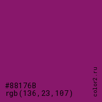 Цвет #88176B в цветовой модели RGB обозначается тремя октетами (136, 23, 107) в десятичном формате и #88176B в шестнадцатиричном (hex) формате, которые являются интенсивностью красного 136 (hex 88), интенсивность зелёного 23 (hex 17) и интенсивность синего 107 (hex 6B).