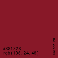 Цвет #881828 в цветовой модели RGB обозначается тремя октетами (136, 24, 40) в десятичном формате и #881828 в шестнадцатиричном (hex) формате, которые являются интенсивностью красного 136 (hex 88), интенсивность зелёного 24 (hex 18) и интенсивность синего 40 (hex 28).