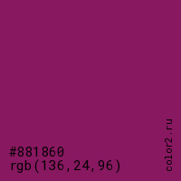 Цвет #881860 в цветовой модели RGB обозначается тремя октетами (136, 24, 96) в десятичном формате и #881860 в шестнадцатиричном (hex) формате, которые являются интенсивностью красного 136 (hex 88), интенсивность зелёного 24 (hex 18) и интенсивность синего 96 (hex 60).