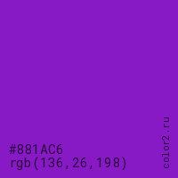 Цвет #881AC6 в цветовой модели RGB обозначается тремя октетами (136, 26, 198) в десятичном формате и #881AC6 в шестнадцатиричном (hex) формате, которые являются интенсивностью красного 136 (hex 88), интенсивность зелёного 26 (hex 1A) и интенсивность синего 198 (hex C6).