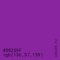 Цвет #88259F в цветовой модели RGB обозначается тремя октетами (136, 37, 159) в десятичном формате и #88259F в шестнадцатиричном (hex) формате, которые являются интенсивностью красного 136 (hex 88), интенсивность зелёного 37 (hex 25) и интенсивность синего 159 (hex 9F).
