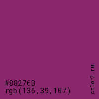 Цвет #88276B в цветовой модели RGB обозначается тремя октетами (136, 39, 107) в десятичном формате и #88276B в шестнадцатиричном (hex) формате, которые являются интенсивностью красного 136 (hex 88), интенсивность зелёного 39 (hex 27) и интенсивность синего 107 (hex 6B).