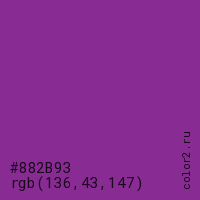 Цвет #882B93 в цветовой модели RGB обозначается тремя октетами (136, 43, 147) в десятичном формате и #882B93 в шестнадцатиричном (hex) формате, которые являются интенсивностью красного 136 (hex 88), интенсивность зелёного 43 (hex 2B) и интенсивность синего 147 (hex 93).