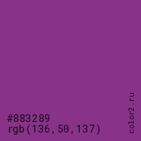 Цвет #883289 в цветовой модели RGB обозначается тремя октетами (136, 50, 137) в десятичном формате и #883289 в шестнадцатиричном (hex) формате, которые являются интенсивностью красного 136 (hex 88), интенсивность зелёного 50 (hex 32) и интенсивность синего 137 (hex 89).