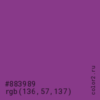Цвет #883989 в цветовой модели RGB обозначается тремя октетами (136, 57, 137) в десятичном формате и #883989 в шестнадцатиричном (hex) формате, которые являются интенсивностью красного 136 (hex 88), интенсивность зелёного 57 (hex 39) и интенсивность синего 137 (hex 89).