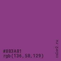 Цвет #883A81 в цветовой модели RGB обозначается тремя октетами (136, 58, 129) в десятичном формате и #883A81 в шестнадцатиричном (hex) формате, которые являются интенсивностью красного 136 (hex 88), интенсивность зелёного 58 (hex 3A) и интенсивность синего 129 (hex 81).