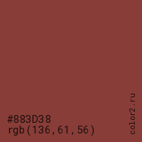 Цвет #883D38 в цветовой модели RGB обозначается тремя октетами (136, 61, 56) в десятичном формате и #883D38 в шестнадцатиричном (hex) формате, которые являются интенсивностью красного 136 (hex 88), интенсивность зелёного 61 (hex 3D) и интенсивность синего 56 (hex 38).