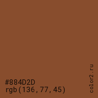 Цвет #884D2D в цветовой модели RGB обозначается тремя октетами (136, 77, 45) в десятичном формате и #884D2D в шестнадцатиричном (hex) формате, которые являются интенсивностью красного 136 (hex 88), интенсивность зелёного 77 (hex 4D) и интенсивность синего 45 (hex 2D).