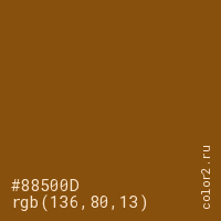 Цвет #88500D в цветовой модели RGB обозначается тремя октетами (136, 80, 13) в десятичном формате и #88500D в шестнадцатиричном (hex) формате, которые являются интенсивностью красного 136 (hex 88), интенсивность зелёного 80 (hex 50) и интенсивность синего 13 (hex 0D).
