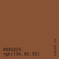 Цвет #885335 в цветовой модели RGB обозначается тремя октетами (136, 83, 53) в десятичном формате и #885335 в шестнадцатиричном (hex) формате, которые являются интенсивностью красного 136 (hex 88), интенсивность зелёного 83 (hex 53) и интенсивность синего 53 (hex 35).