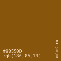 Цвет #88550D в цветовой модели RGB обозначается тремя октетами (136, 85, 13) в десятичном формате и #88550D в шестнадцатиричном (hex) формате, которые являются интенсивностью красного 136 (hex 88), интенсивность зелёного 85 (hex 55) и интенсивность синего 13 (hex 0D).