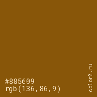 Цвет #885609 в цветовой модели RGB обозначается тремя октетами (136, 86, 9) в десятичном формате и #885609 в шестнадцатиричном (hex) формате, которые являются интенсивностью красного 136 (hex 88), интенсивность зелёного 86 (hex 56) и интенсивность синего 9 (hex 09).