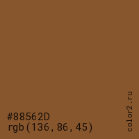 Цвет #88562D в цветовой модели RGB обозначается тремя октетами (136, 86, 45) в десятичном формате и #88562D в шестнадцатиричном (hex) формате, которые являются интенсивностью красного 136 (hex 88), интенсивность зелёного 86 (hex 56) и интенсивность синего 45 (hex 2D).