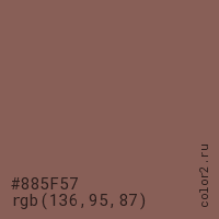 Цвет #885F57 в цветовой модели RGB обозначается тремя октетами (136, 95, 87) в десятичном формате и #885F57 в шестнадцатиричном (hex) формате, которые являются интенсивностью красного 136 (hex 88), интенсивность зелёного 95 (hex 5F) и интенсивность синего 87 (hex 57).
