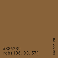 Цвет #886239 в цветовой модели RGB обозначается тремя октетами (136, 98, 57) в десятичном формате и #886239 в шестнадцатиричном (hex) формате, которые являются интенсивностью красного 136 (hex 88), интенсивность зелёного 98 (hex 62) и интенсивность синего 57 (hex 39).