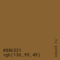 Цвет #886331 в цветовой модели RGB обозначается тремя октетами (136, 99, 49) в десятичном формате и #886331 в шестнадцатиричном (hex) формате, которые являются интенсивностью красного 136 (hex 88), интенсивность зелёного 99 (hex 63) и интенсивность синего 49 (hex 31).