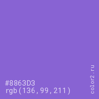 Цвет #8863D3 в цветовой модели RGB обозначается тремя октетами (136, 99, 211) в десятичном формате и #8863D3 в шестнадцатиричном (hex) формате, которые являются интенсивностью красного 136 (hex 88), интенсивность зелёного 99 (hex 63) и интенсивность синего 211 (hex D3).