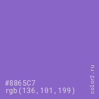 Цвет #8865C7 в цветовой модели RGB обозначается тремя октетами (136, 101, 199) в десятичном формате и #8865C7 в шестнадцатиричном (hex) формате, которые являются интенсивностью красного 136 (hex 88), интенсивность зелёного 101 (hex 65) и интенсивность синего 199 (hex C7).