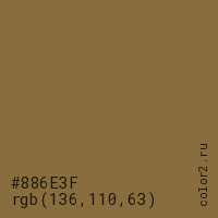 Цвет #886E3F в цветовой модели RGB обозначается тремя октетами (136, 110, 63) в десятичном формате и #886E3F в шестнадцатиричном (hex) формате, которые являются интенсивностью красного 136 (hex 88), интенсивность зелёного 110 (hex 6E) и интенсивность синего 63 (hex 3F).