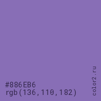 Цвет #886EB6 в цветовой модели RGB обозначается тремя октетами (136, 110, 182) в десятичном формате и #886EB6 в шестнадцатиричном (hex) формате, которые являются интенсивностью красного 136 (hex 88), интенсивность зелёного 110 (hex 6E) и интенсивность синего 182 (hex B6).