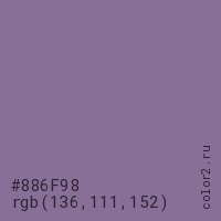 Цвет #886F98 в цветовой модели RGB обозначается тремя октетами (136, 111, 152) в десятичном формате и #886F98 в шестнадцатиричном (hex) формате, которые являются интенсивностью красного 136 (hex 88), интенсивность зелёного 111 (hex 6F) и интенсивность синего 152 (hex 98).