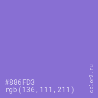 Цвет #886FD3 в цветовой модели RGB обозначается тремя октетами (136, 111, 211) в десятичном формате и #886FD3 в шестнадцатиричном (hex) формате, которые являются интенсивностью красного 136 (hex 88), интенсивность зелёного 111 (hex 6F) и интенсивность синего 211 (hex D3).