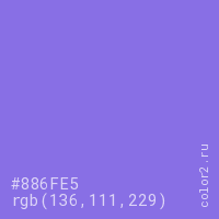 Цвет #886FE5 в цветовой модели RGB обозначается тремя октетами (136, 111, 229) в десятичном формате и #886FE5 в шестнадцатиричном (hex) формате, которые являются интенсивностью красного 136 (hex 88), интенсивность зелёного 111 (hex 6F) и интенсивность синего 229 (hex E5).