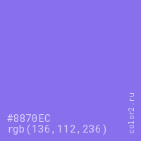 Цвет #8870EC в цветовой модели RGB обозначается тремя октетами (136, 112, 236) в десятичном формате и #8870EC в шестнадцатиричном (hex) формате, которые являются интенсивностью красного 136 (hex 88), интенсивность зелёного 112 (hex 70) и интенсивность синего 236 (hex EC).